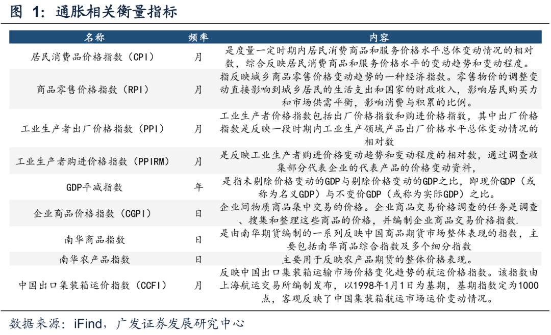 对于通胀的定义包含多个口径,包括从工业、居民、消费者、商品、农产品、进出口等方面的相关通胀指标,其中CPI/PPI是最受关注的通胀指标。