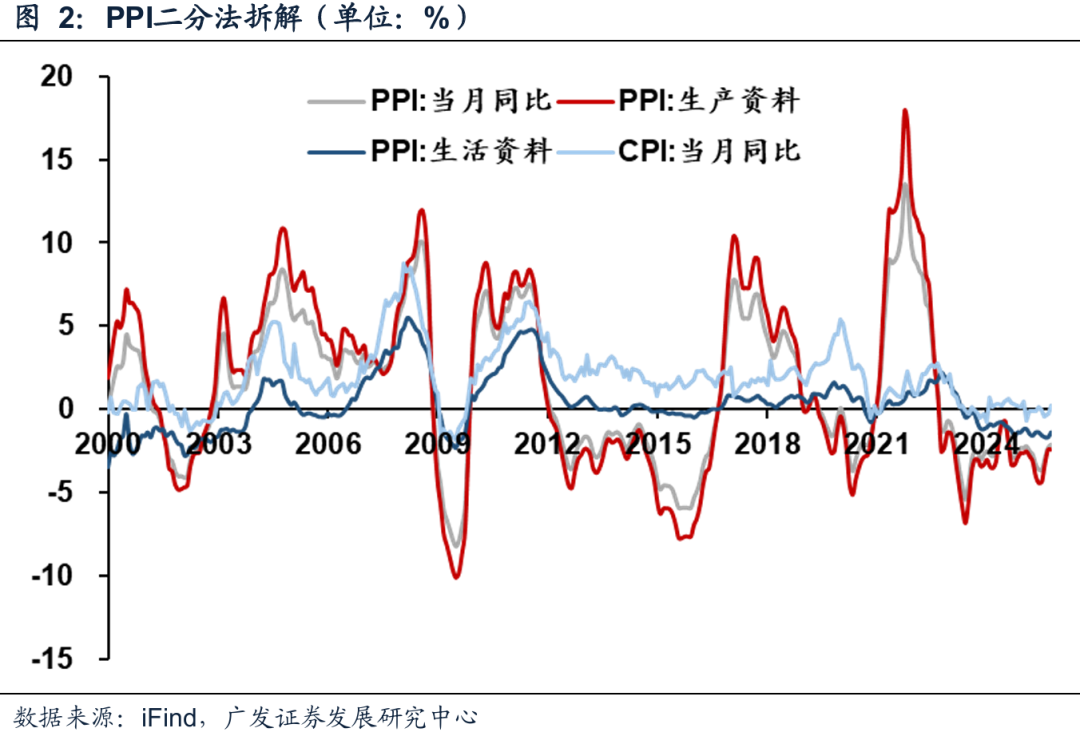 CPI和PPI分别衡量消费端和生产端的通胀水平。从PPI二分法角度上看,CPI与PPI生活资料相关度较高,与PPI生产资料相关度较低,根据2025年数据测算,生产资料占PPI的权重约为75%,是PPI波动的主要贡献项。