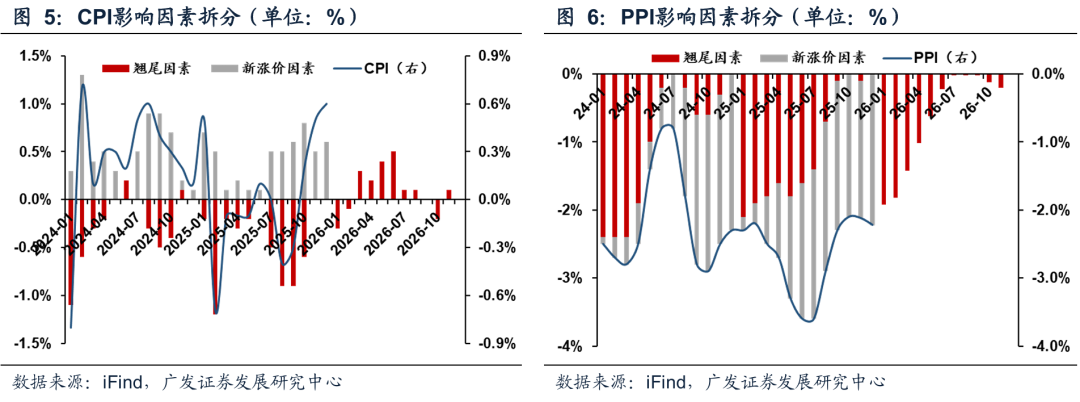 翘尾因素与新涨价因素拆分下,PPI预计上半年依然维持低基数,CPI上半年基数贡献为正。假设11月与12月CPI、PPI环比增速为近5年均值,即CPI分别为-0.3%,0.1%,PPI分别为0.08%、0.2%,全年CPI、PPI分别为0.6%、-2.2%,可得出2026年CPI、PPI翘尾因素。从趋势上看,对于CPI,2024年、2025年新涨价因素均为正,而翘尾因素影响下基本维持在0%,2026年二三季度翘尾因素贡献显著为正;对于PPI,翘尾因素在上半年仍然为负,在新涨价因素为0%下,PPI同比可能依然维持负数。