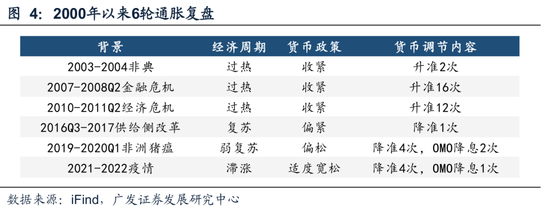 复盘2000年以来的六轮通胀,通胀不必然伴随货币政策的调整。2003-2004年、2007-2008年、2010-2011年三轮全面型通胀,2016-2017年、2019-2020年、2021年-2022年三轮结构性通胀。2024年9月以来,CPI低位运行,政策层面通过降低存量房贷利率、取消住房限购等政策促进经济。
